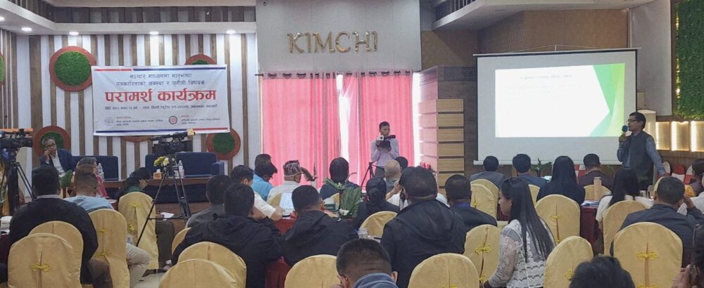 सञ्चारमाध्यममा मातृभाषा पत्रकारिताको अवस्था र चुनौतीबारे परामर्श कार्यक्रम शुक्रबार किम्ची रेस्टुरेन्ट एण्ड ब्याङ्क्वेटमा सम्पन्न भएको छ। कार्यक्रममा मातृभाषामा पत्रकारिताबारे सञ्चारकर्मीहरूले कार्यपत्र प्रस्तुत गरेका थिए।